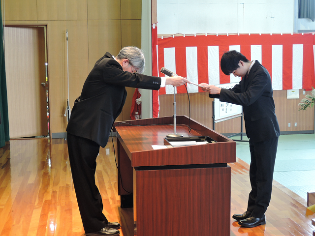 臼田知己校長が、各科の代表に修了証書を手渡し、「自分で決めた道を歩む中で、困難に直面しても、学院の校訓『続けることは力なり』を思い出し、社会の荒波を乗り越えていってください」と式辞を述べました。